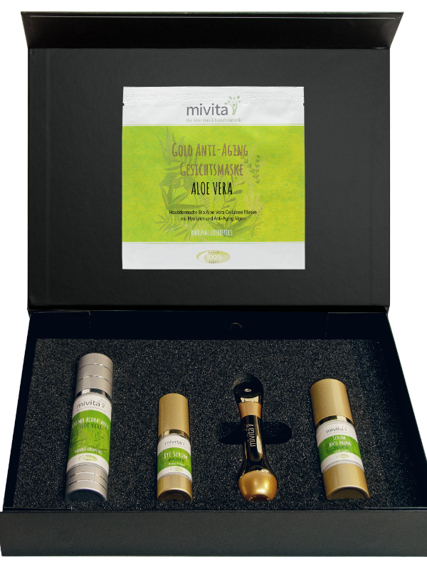 Gold Anti Aging Maske: Aloe Vera Anti-Aging Maske mit Oligo Hyaluron und Juvenessence Algen Extrakt für das beste Anti-Aging Ergebnis! Durch die Fermentation der Inhaltsstoffe, durch ein neuartiges Verfahren, erreichen wir in unserer Maske eine hautidentische laminare Struktur. So ist es dieser Anti Aging Maske möglich die enthaltenen Wirkstoffe deutlich schneller, tiefer und effektiver in die tieferen Hautschichten zu transportieren. Dadurch gelingt es sie schneller genau an die Stellen zu transportieren an denen sie ihre Wirkung schnellst- und bestmöglich entfalten können. Während der Fermentation lassen spezielle Mikroorganismen innerhalb von wenigen Tagen eine Art Bio-Zellulose entstehen, welches der köpereigenen Kollagenmatrix entspricht. Pflanzliche Membranlipide und Hyaluron bilden zusätzlich eine lamellare Struktur zwischen den Fasern, welche der hauteigenen Schutzbarriere entspricht. Hierdurch können überdurchschnittlich gute Anti Aging Effekte und Behandlungsergebnisse erzielt werden. Die natürliche Hautschutzbarriere wird dabei gestärkt und die Haut wirkt straffer und jugendlicher. Kein anderes kosmetisches Präparat kann soviel Feuchtigkeit und Wirkstoffe in die Haut transportieren wie unsere Aloe Vera Anti-Aging Maske. Feuchtigkeitsfaktoren und Hyaluronmoleküle gelangen durch die Bio-Membranmaske in tiefe Hautschichten und können dort ihre optimale Wirkung entfalten.